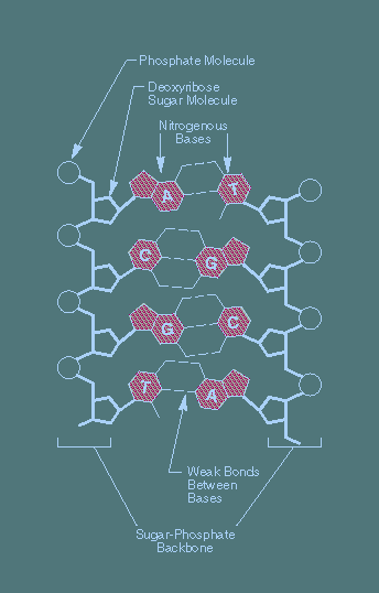 The four nitrogenous bases of DNA are arranged along the sugar- phosphate backbone in a particular order (the DNA sequence), encoding all genetic instructions for an organism. Adenine (A) pairs with thymine (T), while cytosine (C) pairs with guanine (G). The two DNA strands are held together by weak bonds between the bases.